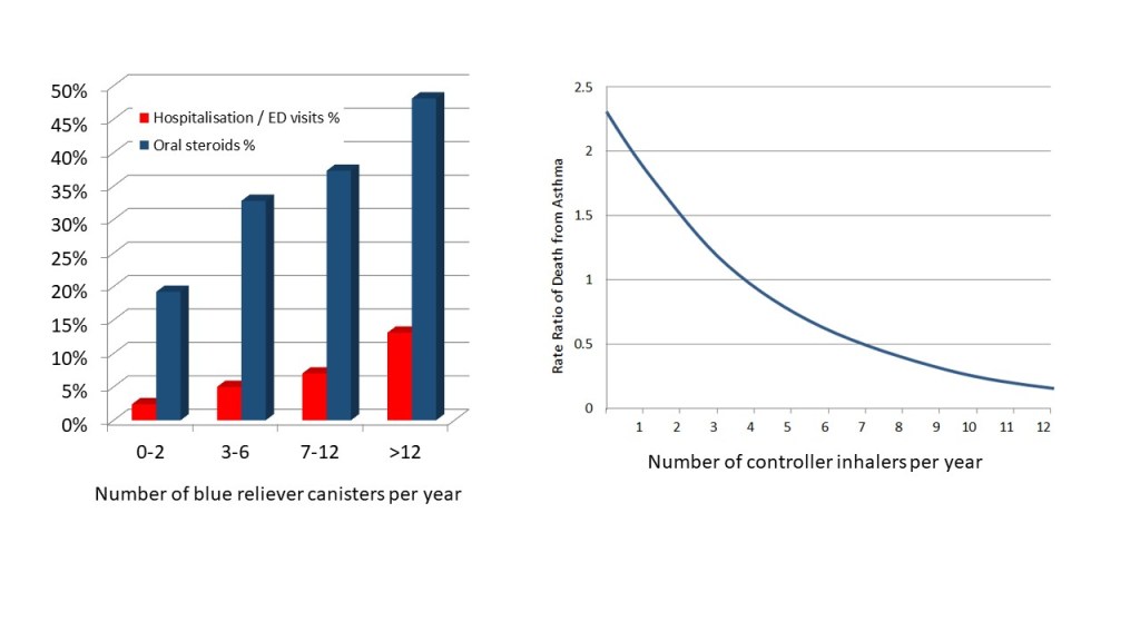 A major problem with the way we treat asthma in the UK (and many other countries), is that we focus too much on treating airway tightening with fast-acting airway openers (blue reliever sprays), and don’t treat the airway inflammation enough. People with uncontrolled airway inflammation suffer more symptoms, need more doses of their reliever inhaler, and are at greater risk of flare-ups and hospital admissions. People who need 3 or more blue inhalers a year are at greater risk, but we know about half of asthma patients in the UK fall into this category.
