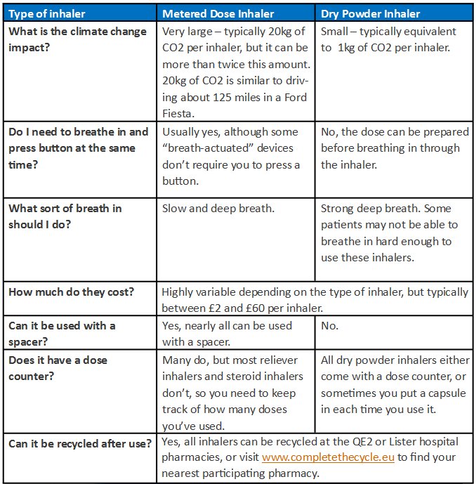 Nobody should settle for sub-standard treatment, and the most important thing is that your disease is well controlled. Patients with poorly controlled asthma not only suffer more symptoms and are more likely to be admitted to hospital, but they also have a larger carbon footprint of care – typically 3 times greater than patients with well-controlled asthma. If you have asthma and are needing 3 or more blue inhalers a year, talk to your healthcare professional about how to get better control of your disease. Make sure you are using your controller treatment regularly and effectively – you may need to step up to a more effective controller inhaler.
