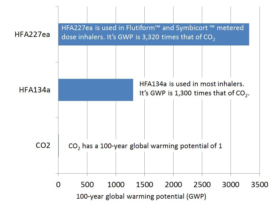Most metered dose inhalers use HFA 134 as their propellant. This is a very potent greenhouse gas, about 1,300 times more potent than carbon dioxide. A couple of inhalers used in the UK (Flutiform™ and Symbicort™ MDI*) use HFA227. This is an even more powerful greenhouse gas; 3,350 times more powerful than CO2. These inhalers therefore have particularly large carbon footprints. Depending on your condition, there may be other more environmentally friendly alternatives, including dry powder inhalers (Fostair Nexthaler™, Symbicort turbohaler™, Fobumix Easyhaler™, Duoresp Spiromax™, Relvar Ellipta™ and Seretide Accuhaler™) or metered dose inhalers containing HFA 134 (such as Fostair™ metered dose inhaler, Combisal™, Sirdupla™, AirFluSal™, Seretide Evohaler™, and Sereflo™) . Talk to your GP or nurse about what alternatives are available.